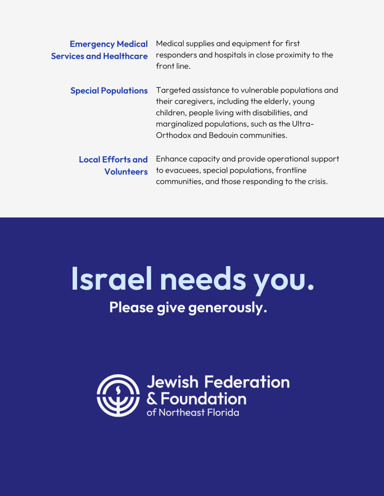 1) Jewish Federation & Foundation of Northeast Florida has opened a fund to support Israel. Please donate here.