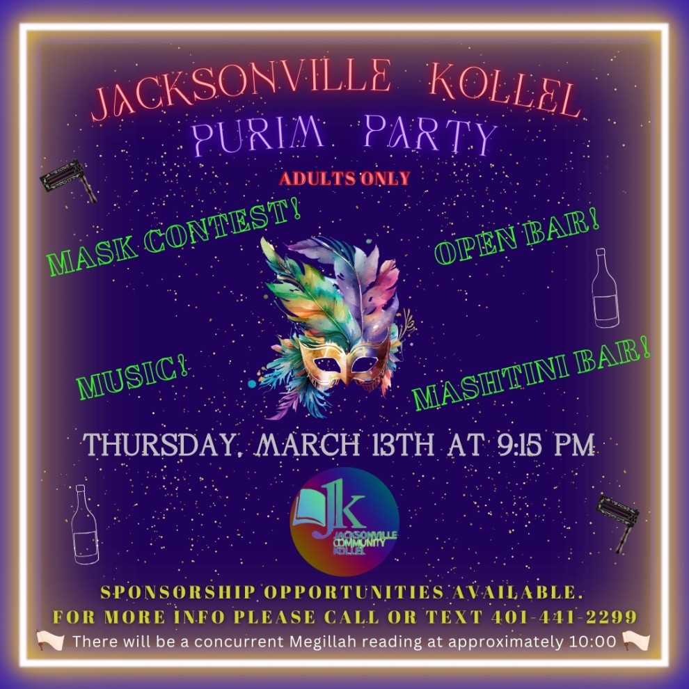 Kollel's Purim Party Thursday, March 13th at 9:15 pm Adults only. Mask contest,, Mashtinis, and Megilla! 3651 Crown Point Road For more info please call 401-441-2299